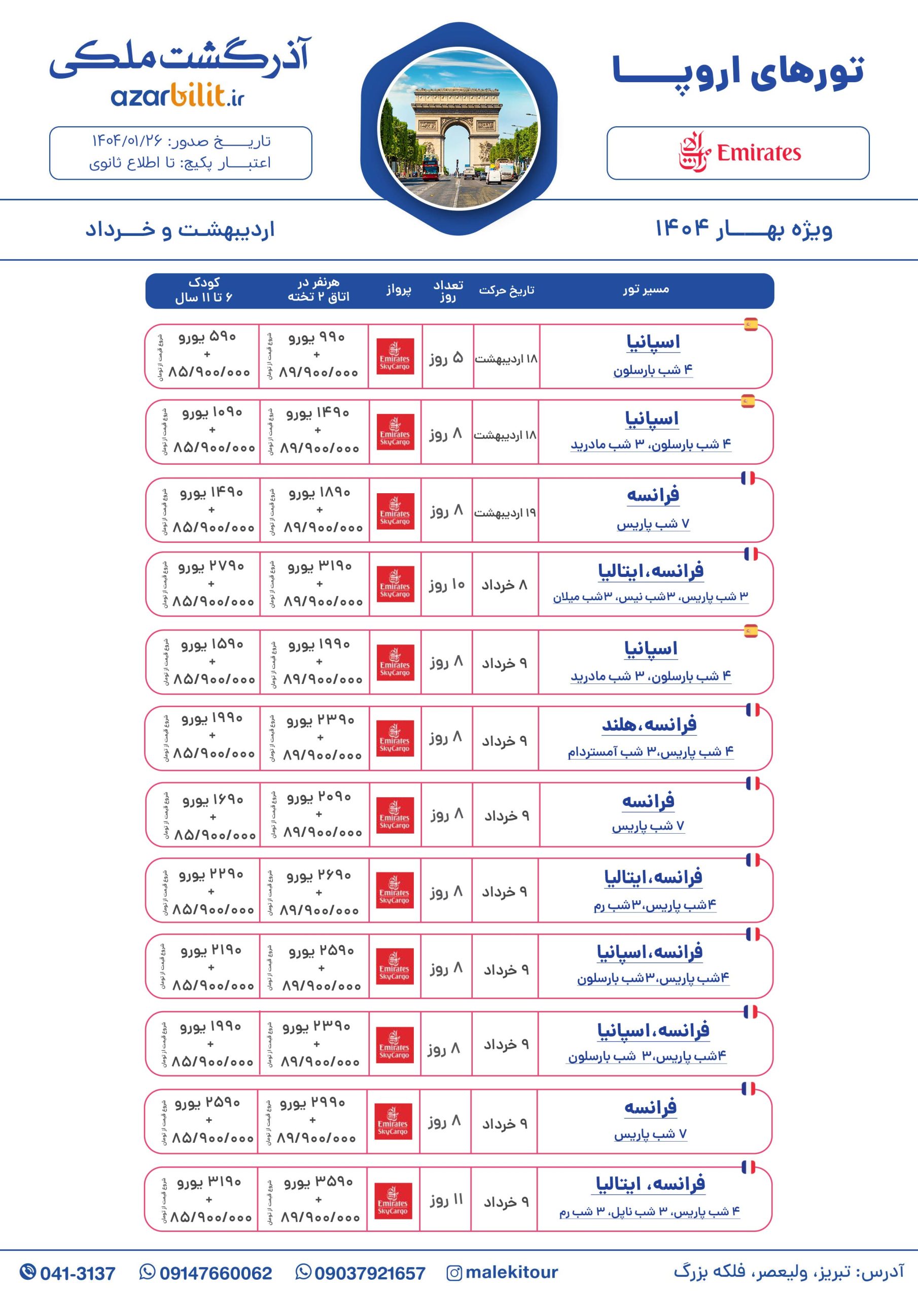 مجله گردشگری آذربلیط - پکیج تور - تور اروپا – ویژه نوروز 1405 – پکیج دوم