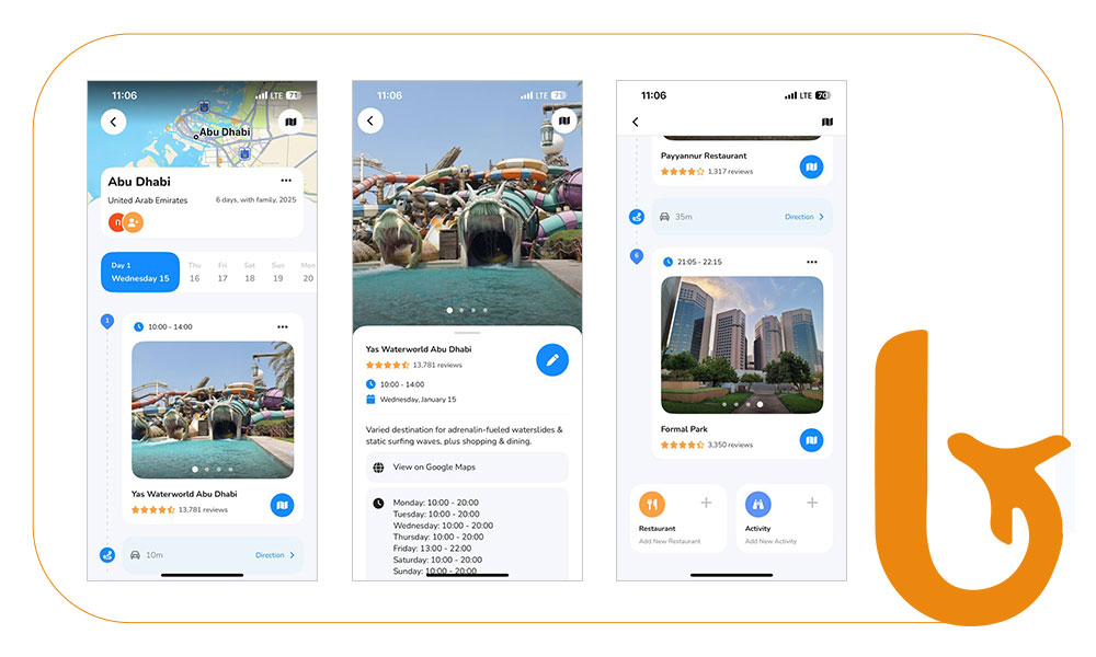 پس از سپری شن چند لحظه، iplan.ai یک برنامه ریزی دقیق برای هر ساعت شما ارائه میدهد. این برنامه روی نقشه برای شما ترسیم شده است و هر مکان دارای جزئیاتی مانند اینکه معمولا افراد چه مدت زمانی را در آنجا سپری میکنند. مدت زمان رسیدن به مکان مورد نظر را تخمین میزند و حالتهای حمل و نقل را برای شما مشخص میکند. شما میتوانید این برنامه را با دوستان یا خانواده خود به اشتراک بگذارید. آذربلیت با ارائه بهترین پیشنهادات و با در نظر گرفتن ارزشمندی زمان گرانبهای شما آماده ارائه بهترین خدمات سفر برای شما عزیزان میباشد.
